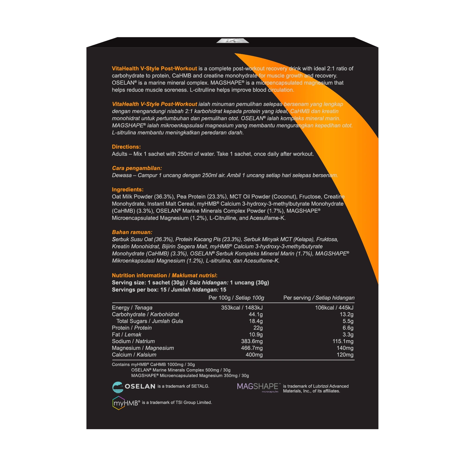 VitaHealth V-Style Post-Workout is a comprehensive post-workout recovery drink crafted with myHMB®, OSELAN®, MagShape®, creatine monohydrate, L-citrulline and other key nutrients.
